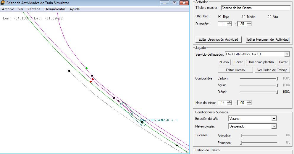 En el indicador correspondiente a los horarios (yo lo tengo en castellano) que dice PROXIMA ESTACION, vamos a ver que arriba de todo dice "Hora". Allí se consigna la hora que muestra el Editor de actividades, en este caso 14.00, pero si nos remitimos a lo indicado más abajo donde se lee: Llegada - Actual - Salida - Actual , el horario varía. Este es el horario que SIEMPRE debemos observar. Para este caso especial las 14.06 ó 05, no recuerdo en este momento. Esto sucede por la cantidad de viajeros que abordan el tren en esa estación en particular cuya cantidad podemos determinar nosotros también. Por ejemplo, para este tren que parte de Alta Córdoba la cantidad de pasajeros a subir pueden ser 40, 50, o más.