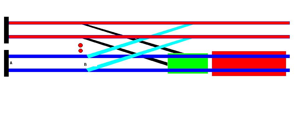 Ahora una consulta tecnica: segun la imagen verde la loco y rojo los vagones. Ahora bien yo tengo que llevar la loco al otro extremo de la formación llendo hasta el paragole y luego por el desvío celeste. Ahora la cuestión es donde colocar el punto de retorno: en el punto "A" en el punto "B" o antes de la señal o en otro lado. Lo digo porque yo voy hasta pasando el desvío y cuando invierto marcha me dice que he pasado una pase luz roja.