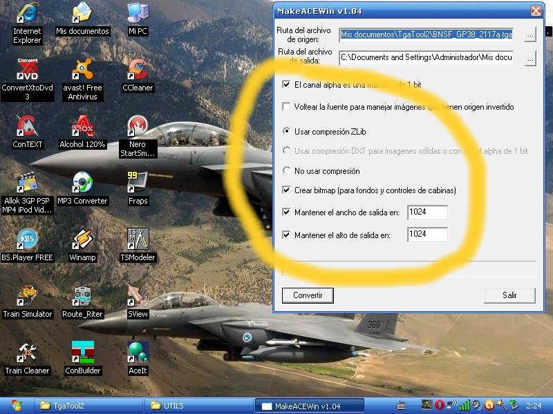 POR FIN lo he conseguido, solamente gracias a vuestra ayuda chicos, con vuestra colaboracion lo he podido realizar, la verdad es que los dos me habeis sido de ayuda porque con el TGATOOD he podido repintar y con el MakeACEWin lo he conseguido transformar a .ace pero el problema es que no hay alpha y ahora pregunto como puedo hacerlo?¿ tengo que hacerlo con el tga tood tengo que modificar el archivo s.