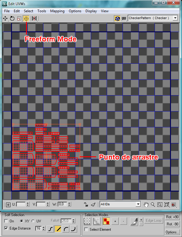 Volvemos a seleccionar el cubo y en modo de vértices ("Vertex") creamos con el ratón un área de selección que incluya todos los nuevos vértices que hemos creado: