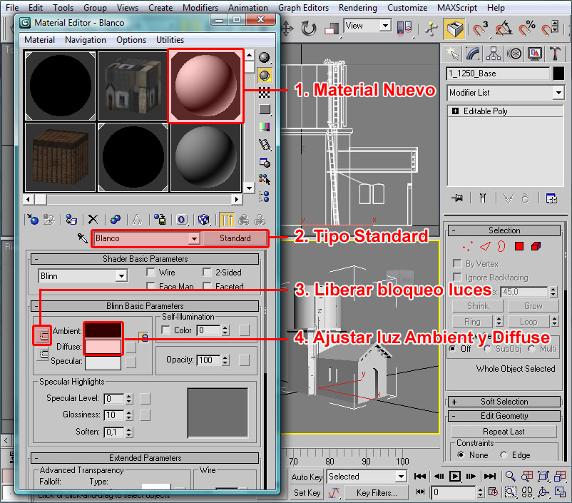 Donde he señalado en rojo el procedural, el cual recuerdo que debe tener todos sus puntos con la coordenada Y=0 (coordenada en 3ds), el pivote centrado en la escena y la extrusión de dicho procedural orientada en la dirección Y del pivot del objeto (con la longitud que deseemos para las texturas).