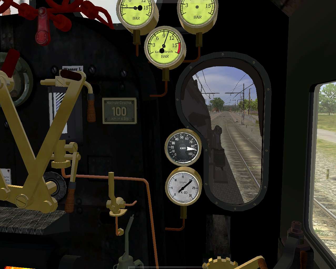 Circulando con ella aislada (todavía no la he probado arrastrando un tren) y conduciéndola desde la cabina (que por cierto es la suya autentica, que ha sido desarrollada por su creador “Astauder”) se tiene una buena sensación de realismo con todos sus mandos básicos.