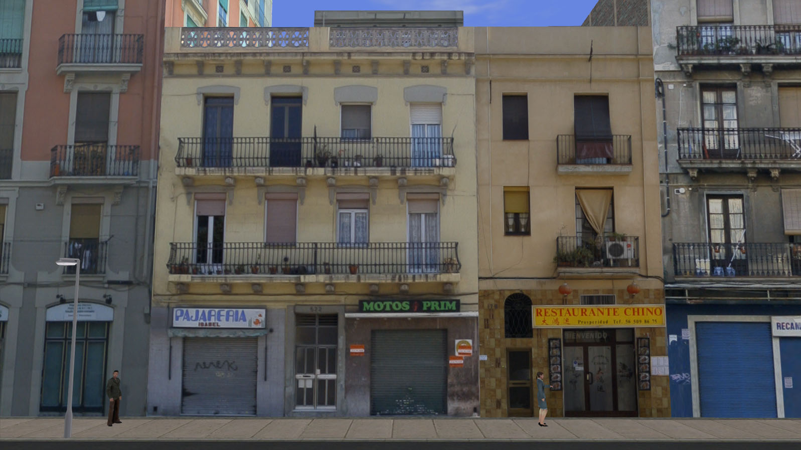 Un par de edificios más con comercios. Uno incluye una tienda de animales y un taller de motos, y el otro el afamado "Lestaulante Chino: Plospelidad", imprescindible en cualquier ciudad española.