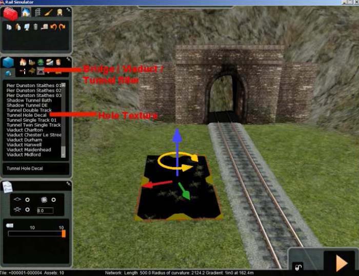 Decals son texturas planas que cubren el terreno. Pueden variarse de tamaño desde las esquinas y laterales y también pueden rotarse. Una vez que el decal está colocado en el túnel, puede ser difícil, aunque no imposible, seleccionarlo de nuevo para ponerlo en su sitio porque la vía o la boca del túnel están muy cerca. Por eso, coloque el decal en el terreno cerca del túnel, y reescalelo al tamaño aproximado de la boca del túnel y en una orientación adecuada (como se muestra en al imagen). Cuando esté satisfecho, selecciónelo y colóquelo sobre la boca del túnel. En modo editor aparecerá como una textura negra, pero en modo conducción será transparente.