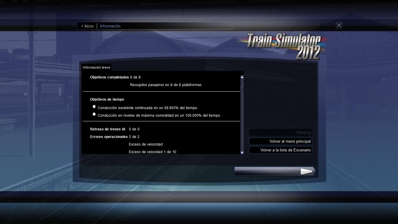 Llegue tarde a todas las estaciones por lo cual el RW en su infomre me dice que no cumplido con 8 objetivos. Cosa con la cual no comparto ya que, una cosa es no parar y otra muy distinto llegar tarde. En tal caso, los creadores del simulador podrían haber puesto en caso como este, su calidad de conducción ha sido mala, regular, etc..