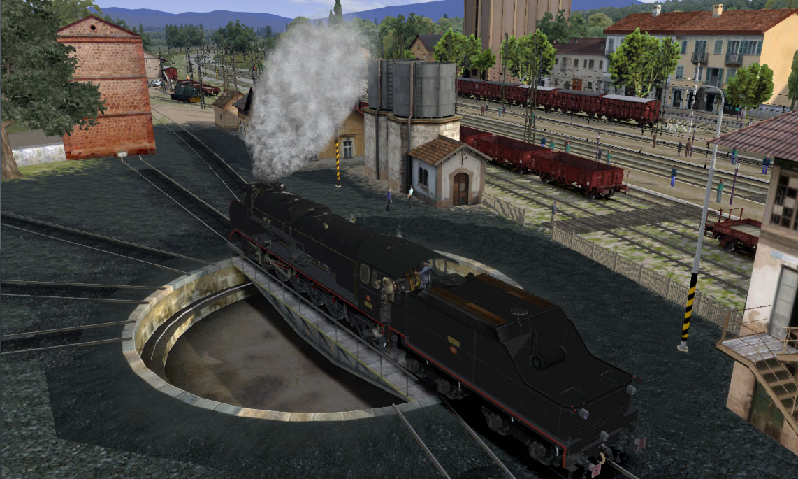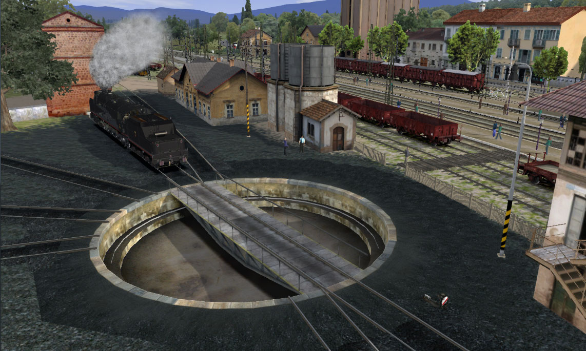 Empieza que debemos dirigirnos con nuestra locomotora hacia el depósito para allí, mediante el puente giratorio, invertir la posición de ésta saliendo después para ir a buscar la composición que debemos arrastrar.