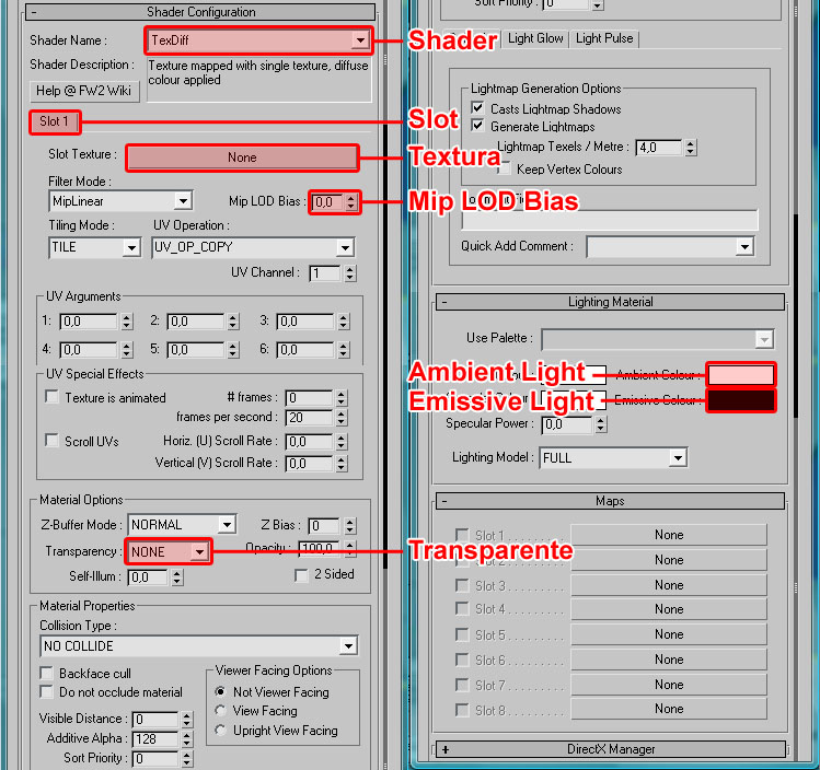 (*) los shaders propios de Kuju, los que terminan con el sufijo ".fx", ignoran estos valores y aplican unos de propios que no podemos controlar, y que unifican la forma en que se iluminan los objetos en el simulador. Por tanto, los valores que se indican son los que deberíamos informar en caso de usar el shader "TexDiff", o cualquier otro de los shaders estándar (no terminados en ".fx").