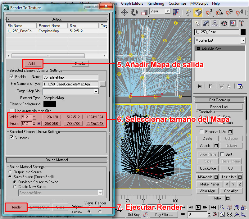 Donde he señalado en rojo el procedural, el cual recuerdo que debe tener todos sus puntos con la coordenada Y=0 (coordenada en 3ds), el pivote centrado en la escena y la extrusión de dicho procedural orientada en la dirección Y del pivot del objeto (con la longitud que deseemos para las texturas).