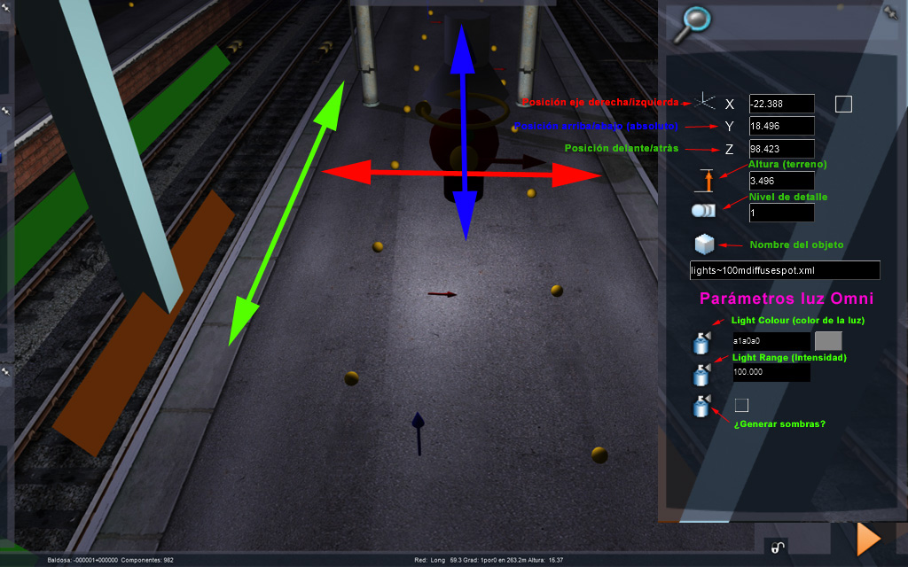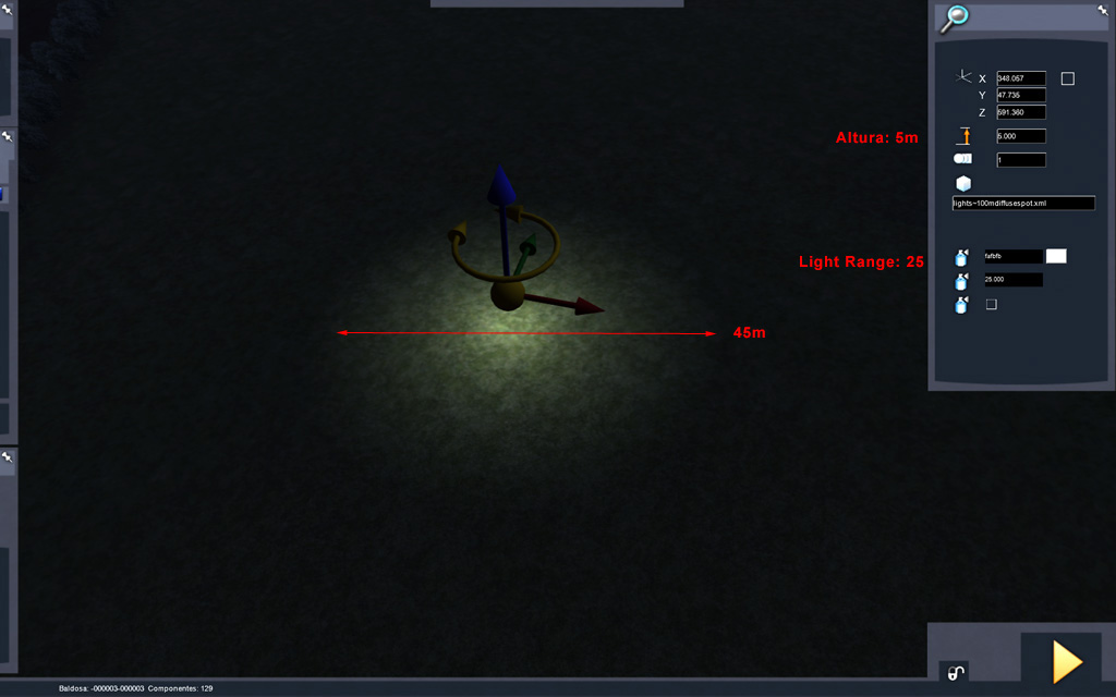 Vamos a conocer mejor los parámetros de ajuste de Altura (terreno) y Light range (intensidad) de las luces Spot: