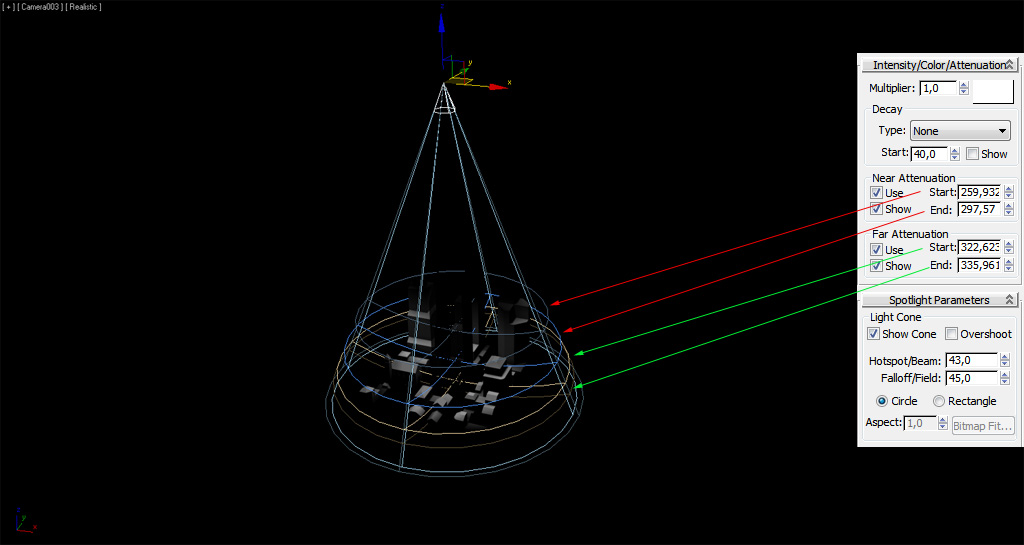 Dentro del cono interior (Inner cone), con el ángulo definido en "Hotspot/Beam" o "Theta" en Directx y RW3, la luz impacta con la máxima intensidad en la zona del círculo interior. La intensidad de la luz va decreciendo hasta llegar a 0 en el espacio delimitado por el cono exterior (Outer cone) según su ángulo definido por "Fallof/Field" o "Phi" en Directx y RW3, delimitando por el cículo exterior la zona a partir de la cual no hay luz.