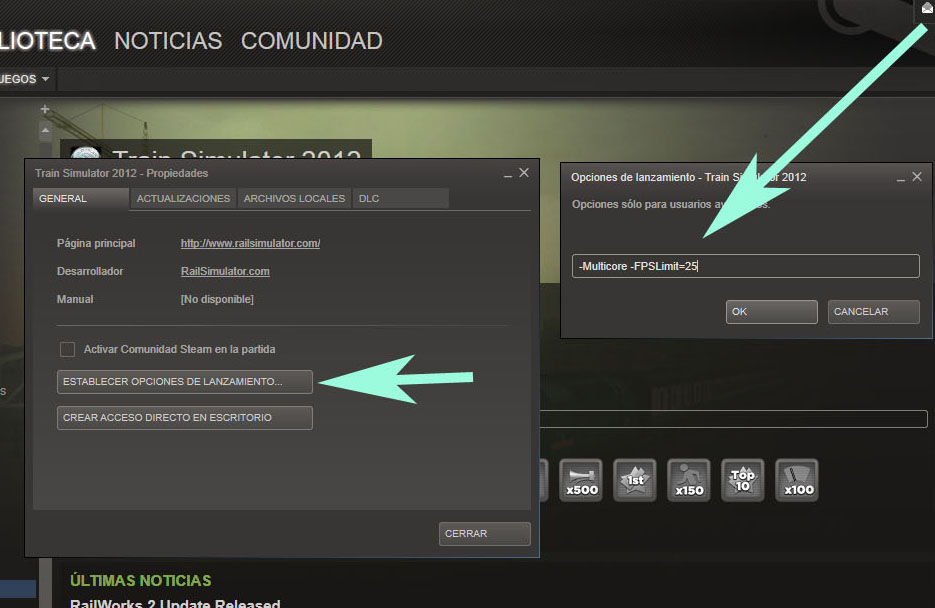 Aceptamos y cerramos propiedades. A partir de ahora, cada vez que arranquemos el simulador desde STEAM, jugaremos con las opciones 'Multicore' y un límite de cuadros por segundo de 25 activadas. Los 25 cuadros por segundo pueden modificarse al valor que deseemos: 30, 25, 15, 60...